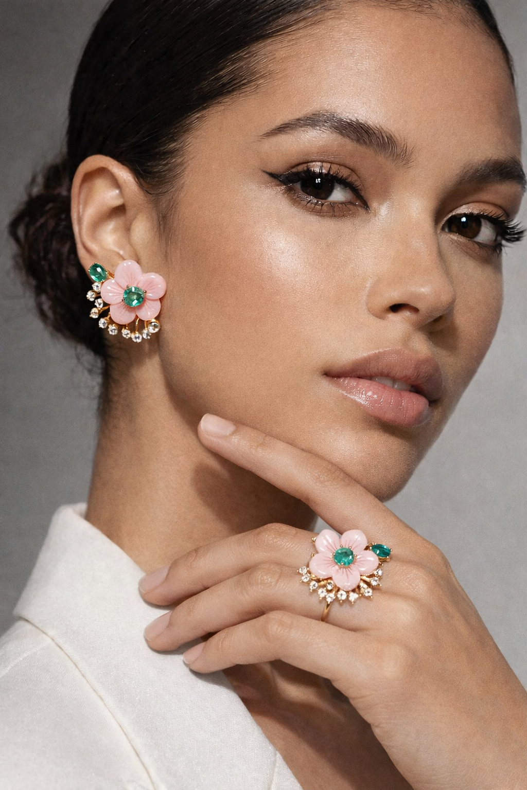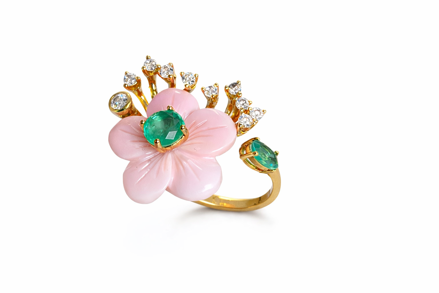 Anel Flores Rosas com Pedra de Esmeralda e Zircônias