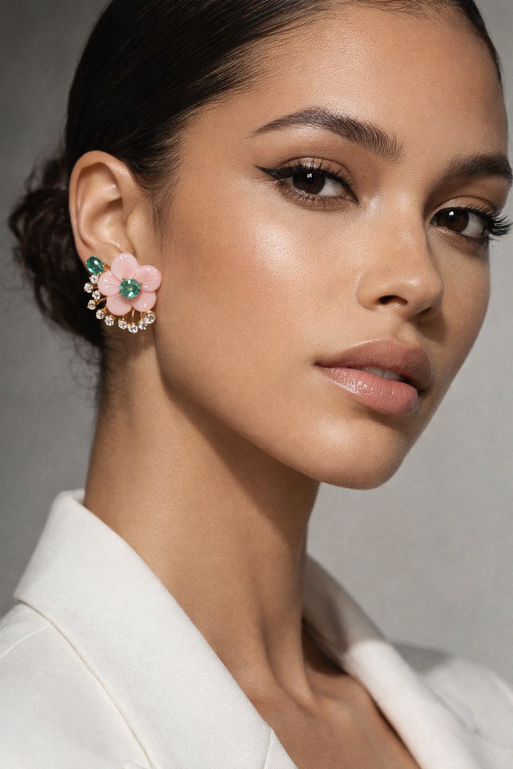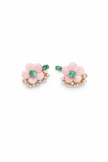 Brinco Flores Rosas com Pedra de Esmeralda e Zircônias
