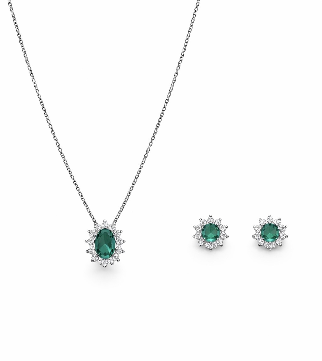 Conjunto Flor com Zircônias Esmeraldas e Brancas Prata 925